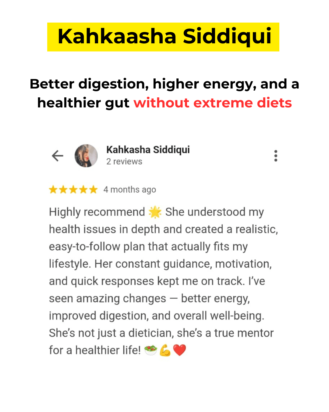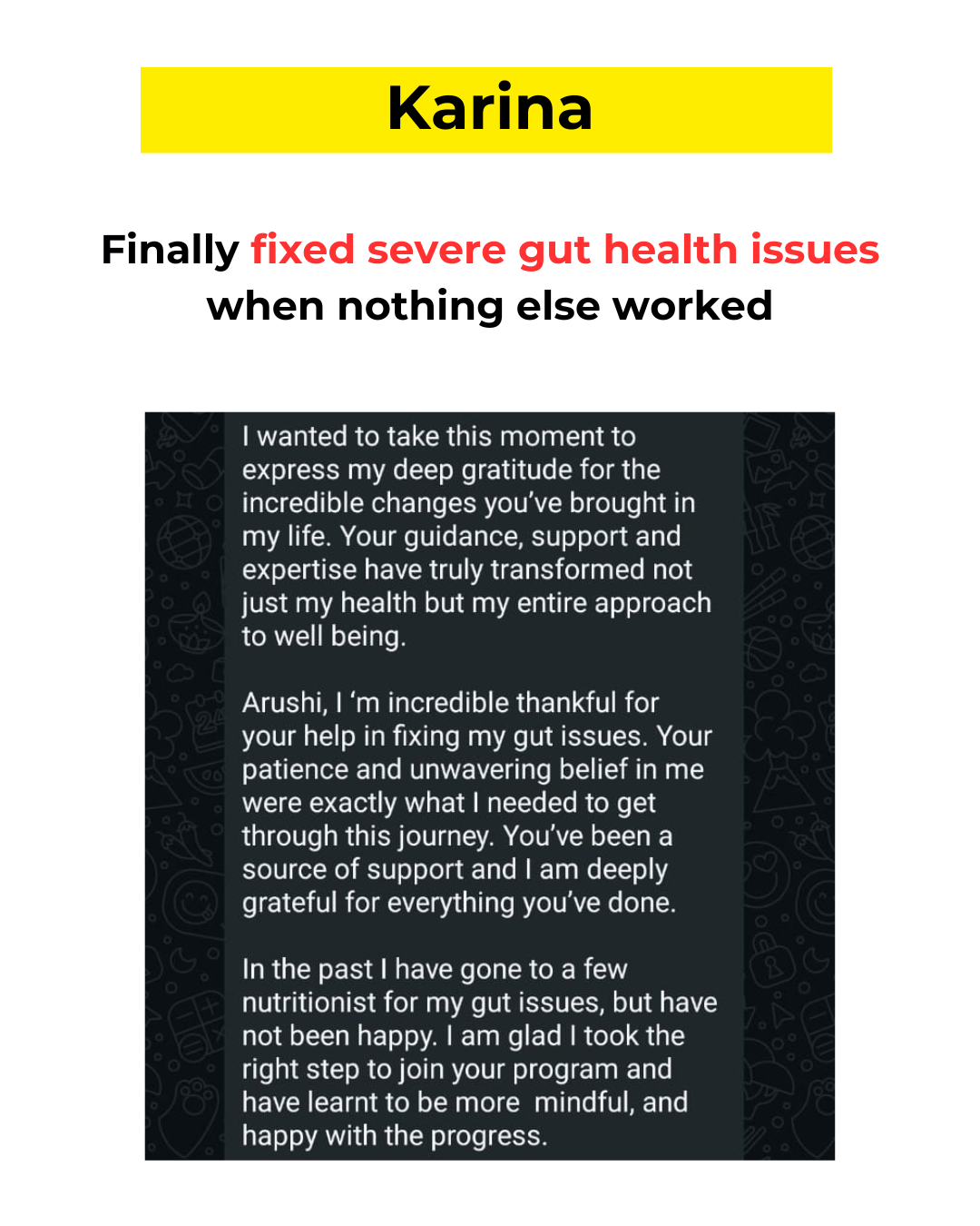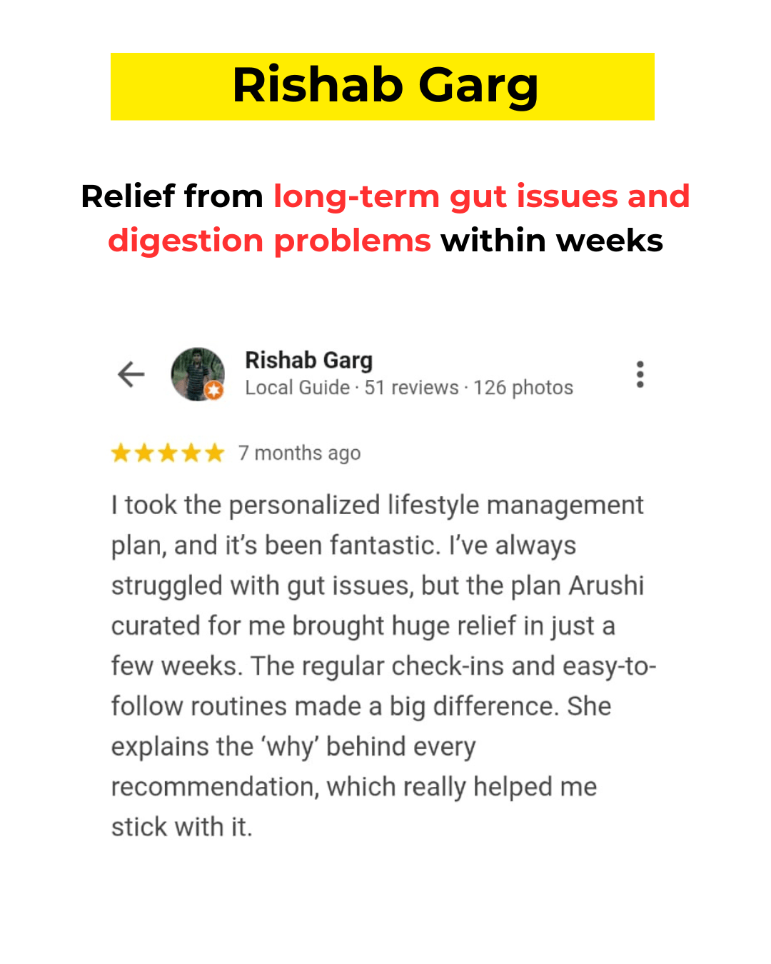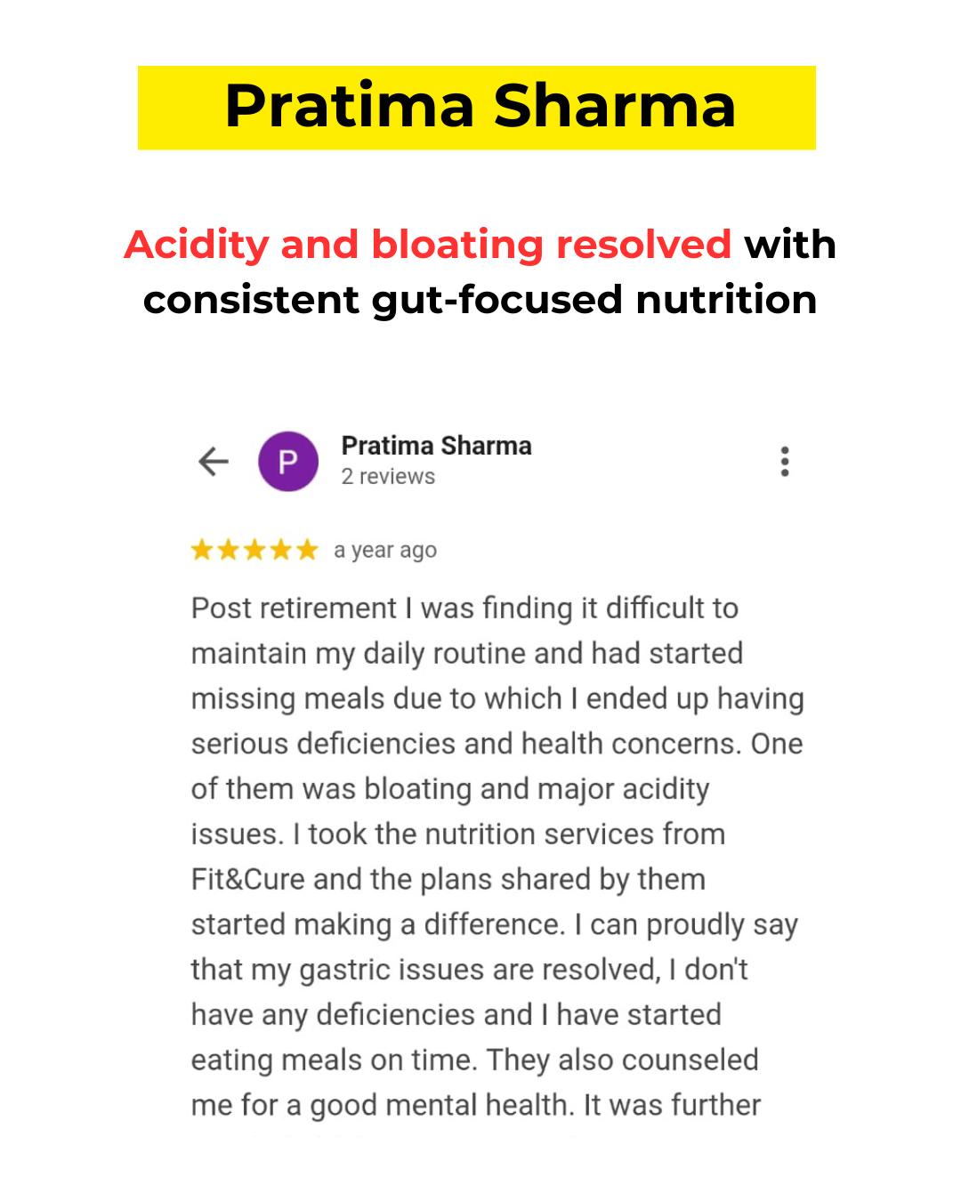I help urban professionals (30–45) restore gut health, eliminate bloating and acidity, and lose 8–15 kg in 12 weeks using my G.U.T.-C.U.R.E™ Method.